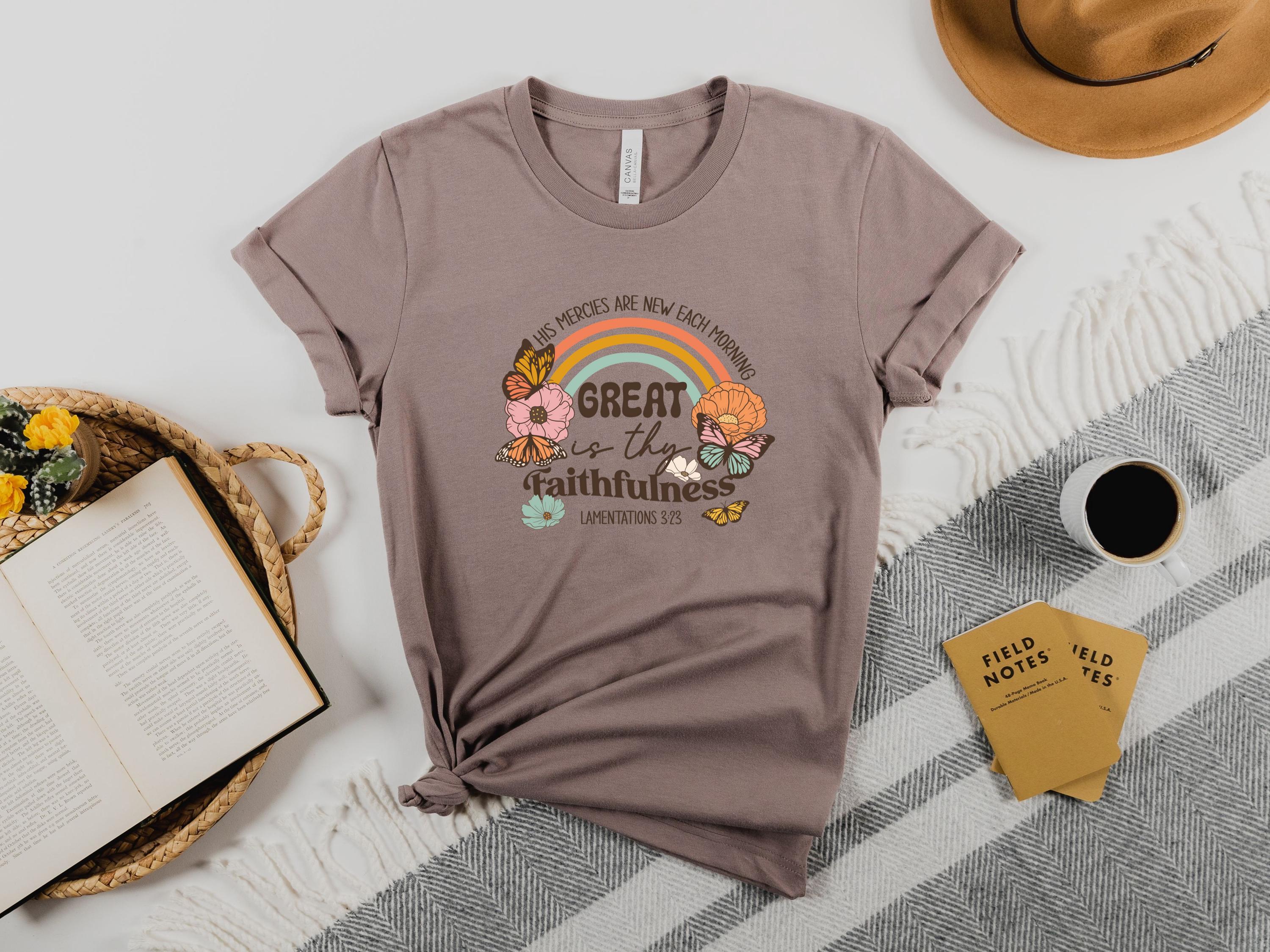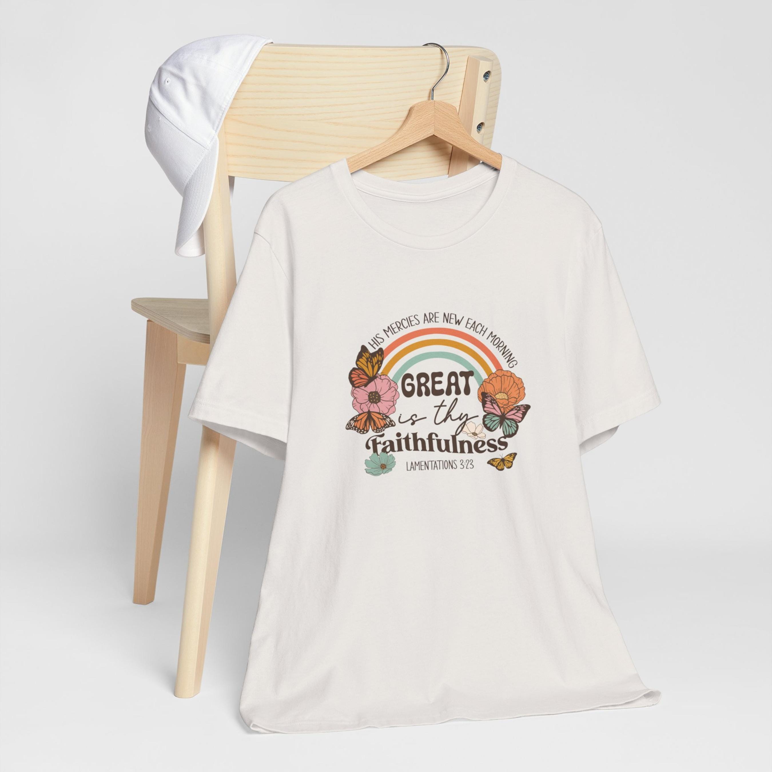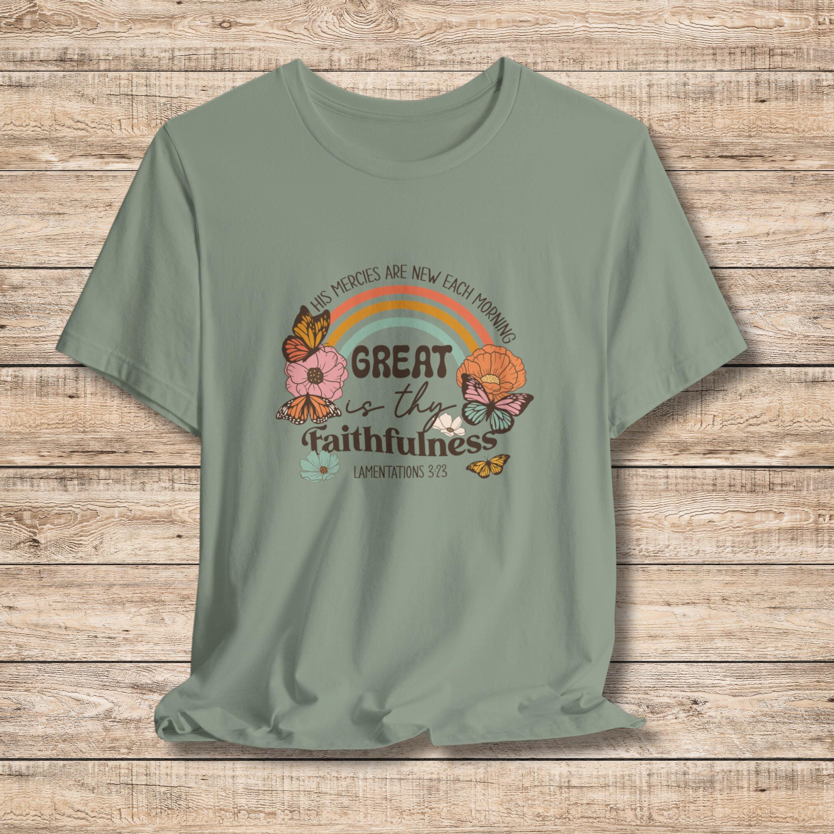 Shine Your Light with this comfy "Great is Thy Faithfulness" Tee! Embrace the power of faith and positivity with our Unisex Jersey Short Sleeve Tee, featuring the powerful message: Great is Thy Faithfulness. This statement tee serves as a beautiful reminder to put your faith on display and share your light with the world, no matter where life takes you.