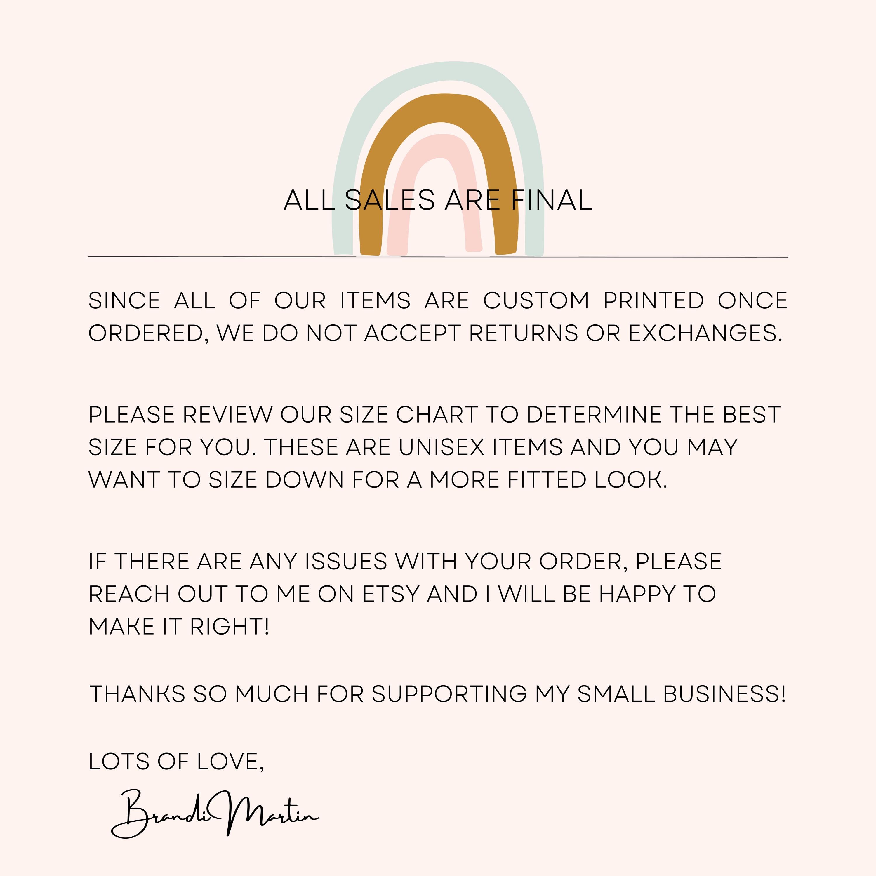 Since all items are made to order, I do not accept refunds or exchanges. However, if there is an issue with your order, please contact me and I will do my best to make it right. If you receive your item and the print quality is poor or the design is not what you ordered, please take a picture of the item and message me on Etsy. Please include your order number in that message. I will have your item reprinted and shipped out to you.