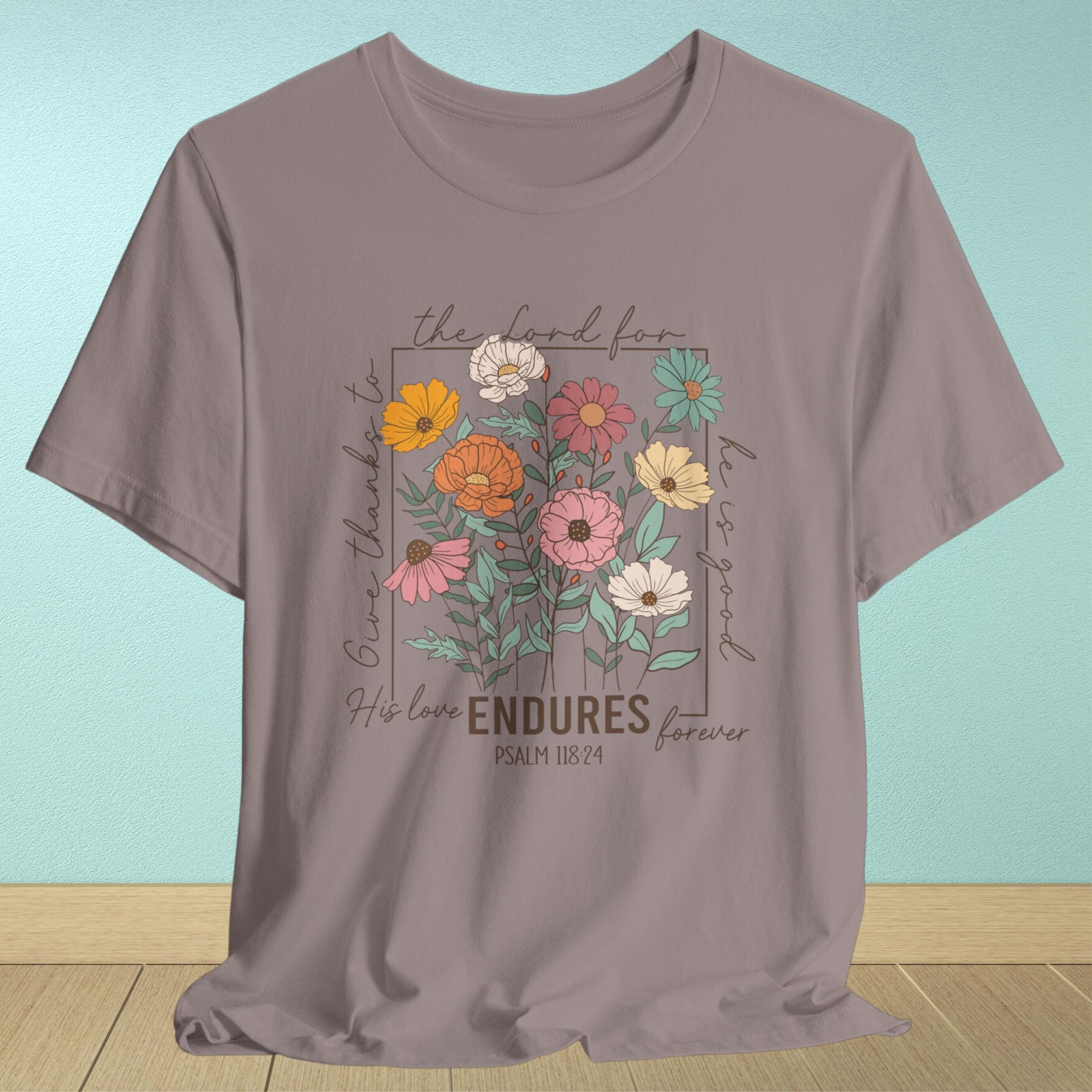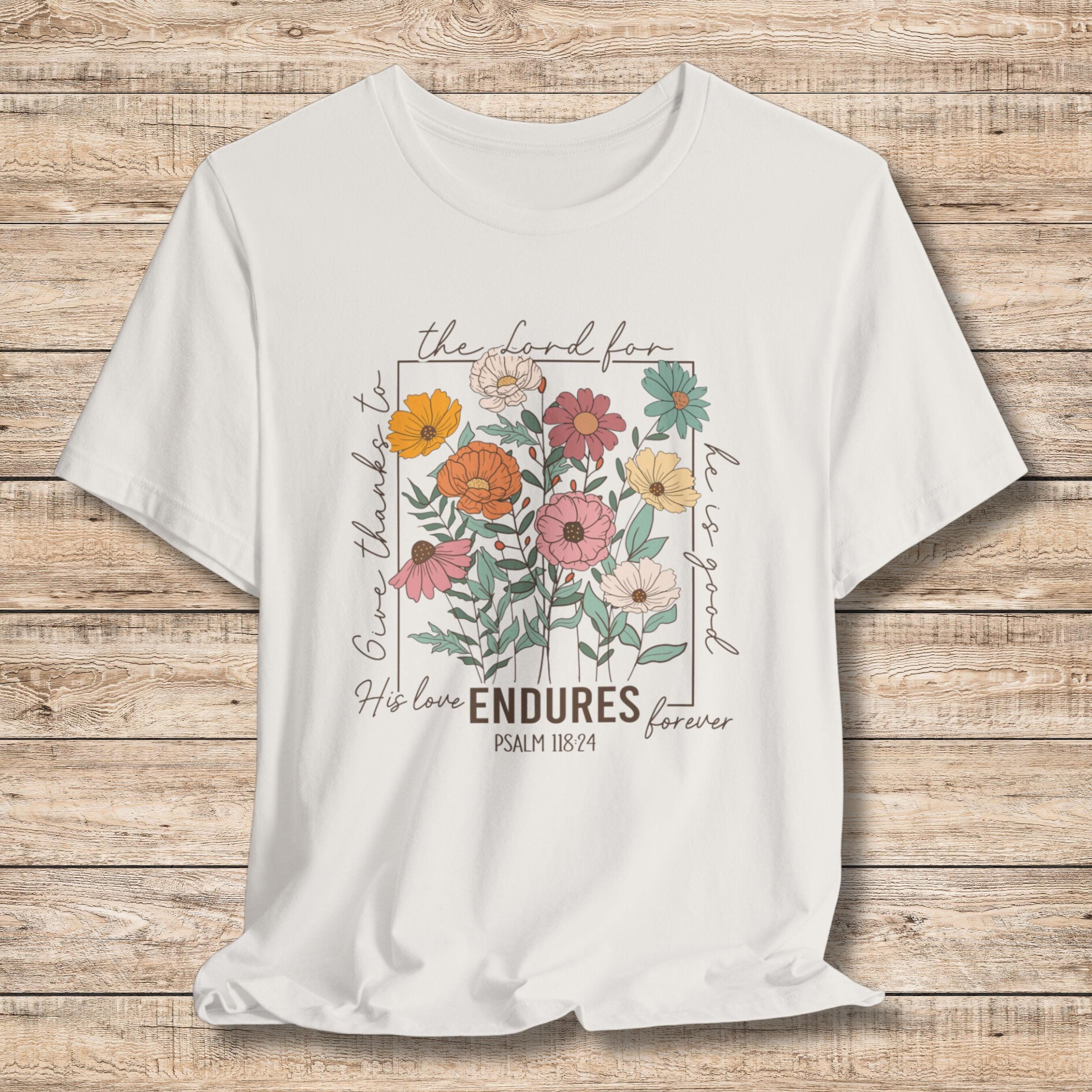 Shine Your Light with this comfy Tee! "Give thanks to the Lord, for He is good, His love endures forever" Psalm 118:24 - Embrace the power of faith and positivity with our Unisex Jersey Short Sleeve Tee. This statement tee serves as a beautiful reminder to put your faith on display and share your light with the world, no matter where life takes you.