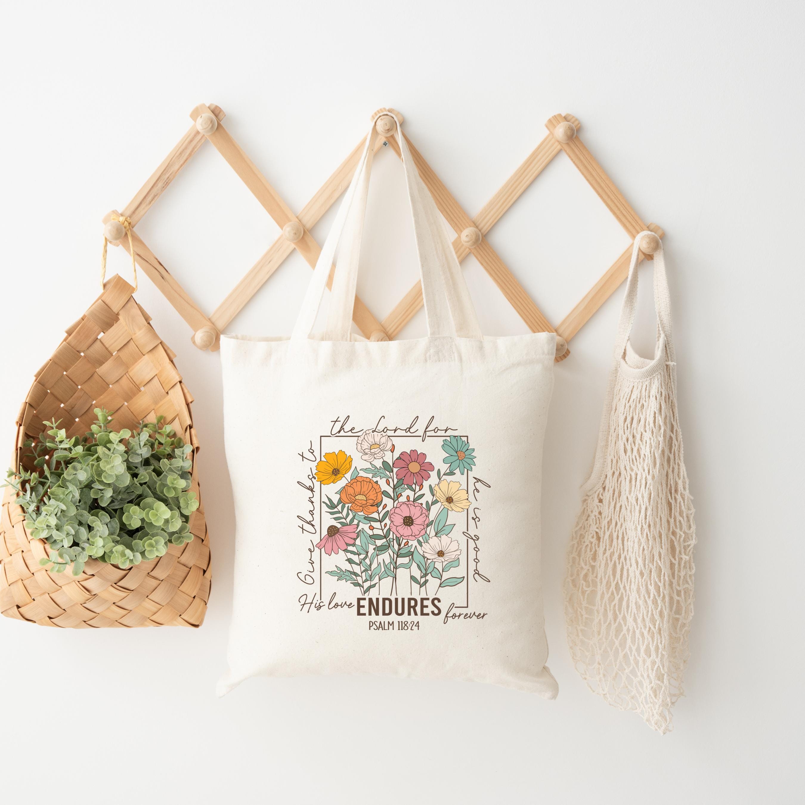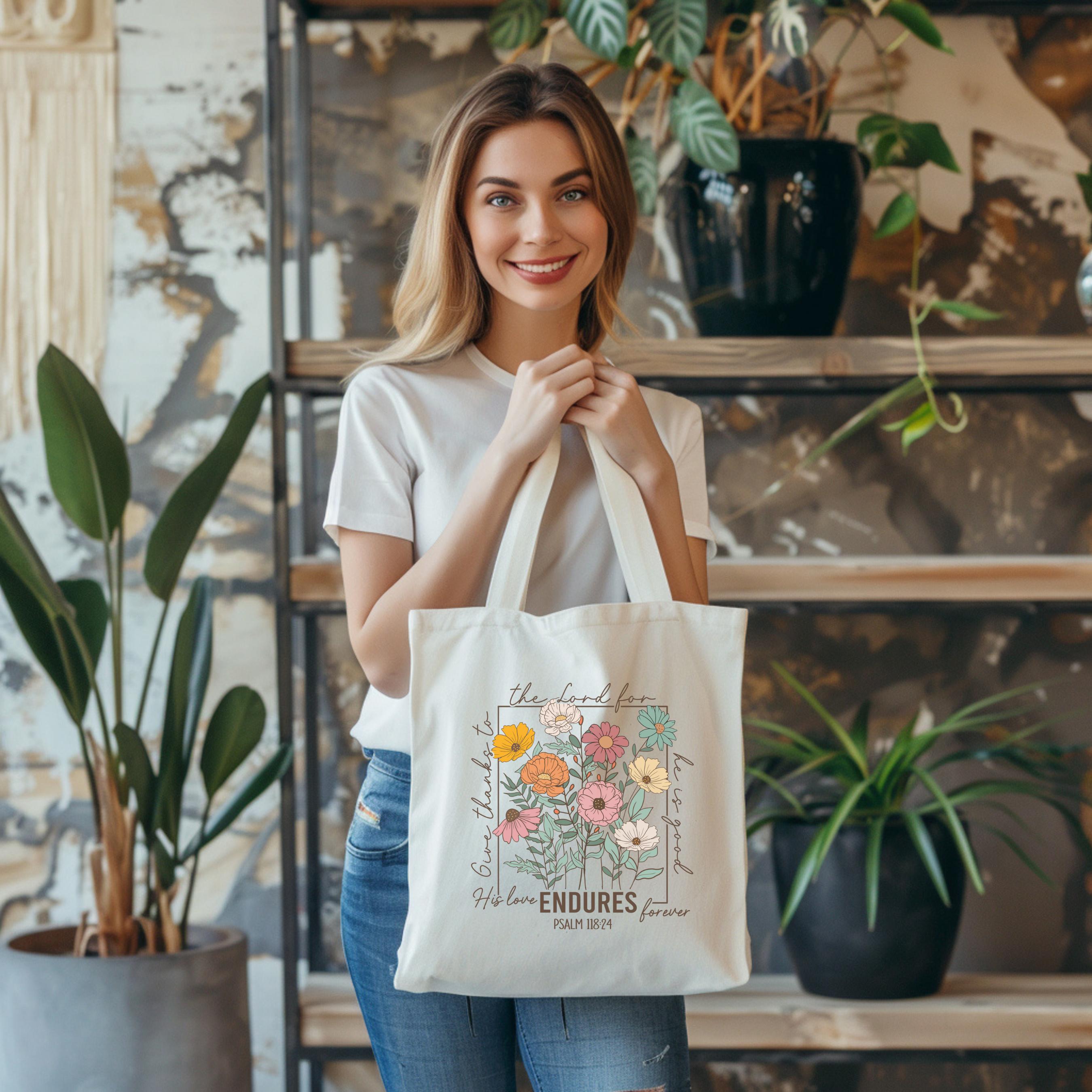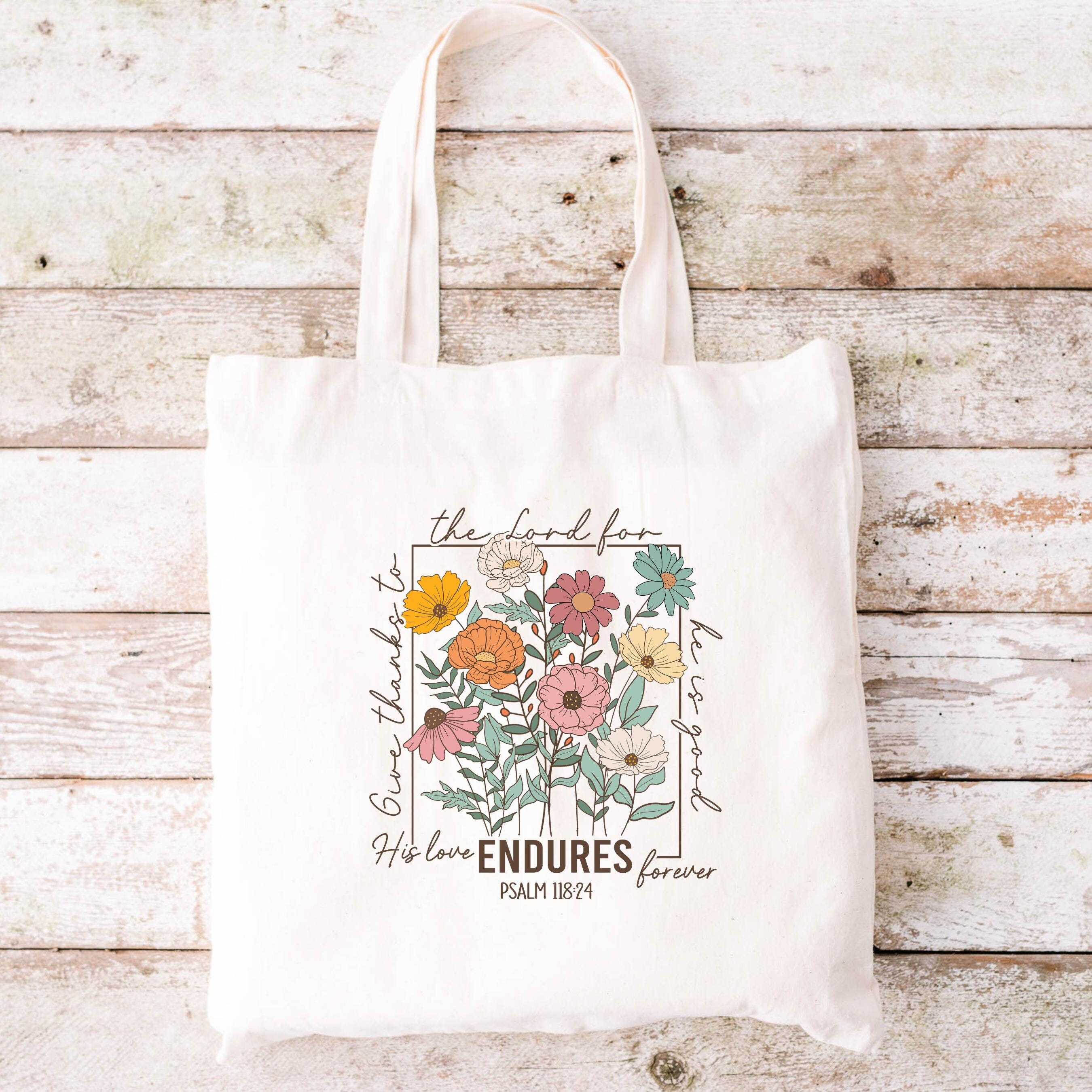Introducing the "His Love Endures Forever" Cotton Canvas Tote Bag—a perfect blend of boho vintage charm and meaningful inspiration. Adorned with a beautiful floral design, this tote offers a gentle reminder of everlasting love wherever you go. Crafted from 100% cotton canvas, it's durable, eco-friendly, and ideal for those who appreciate both style and sustainability.