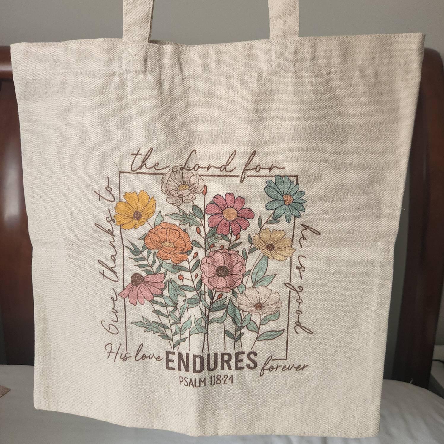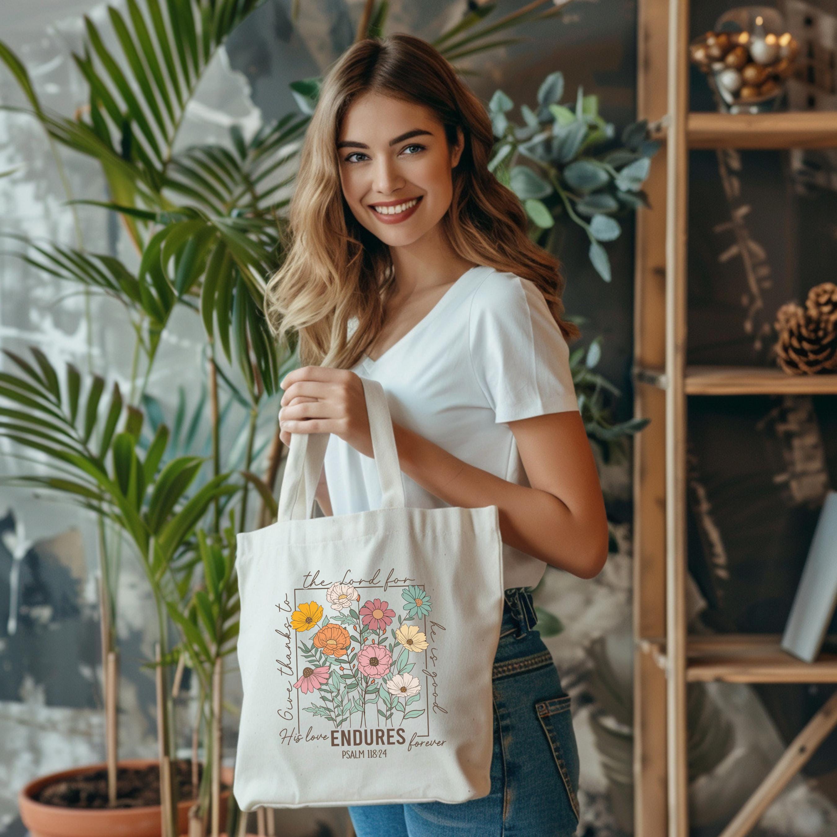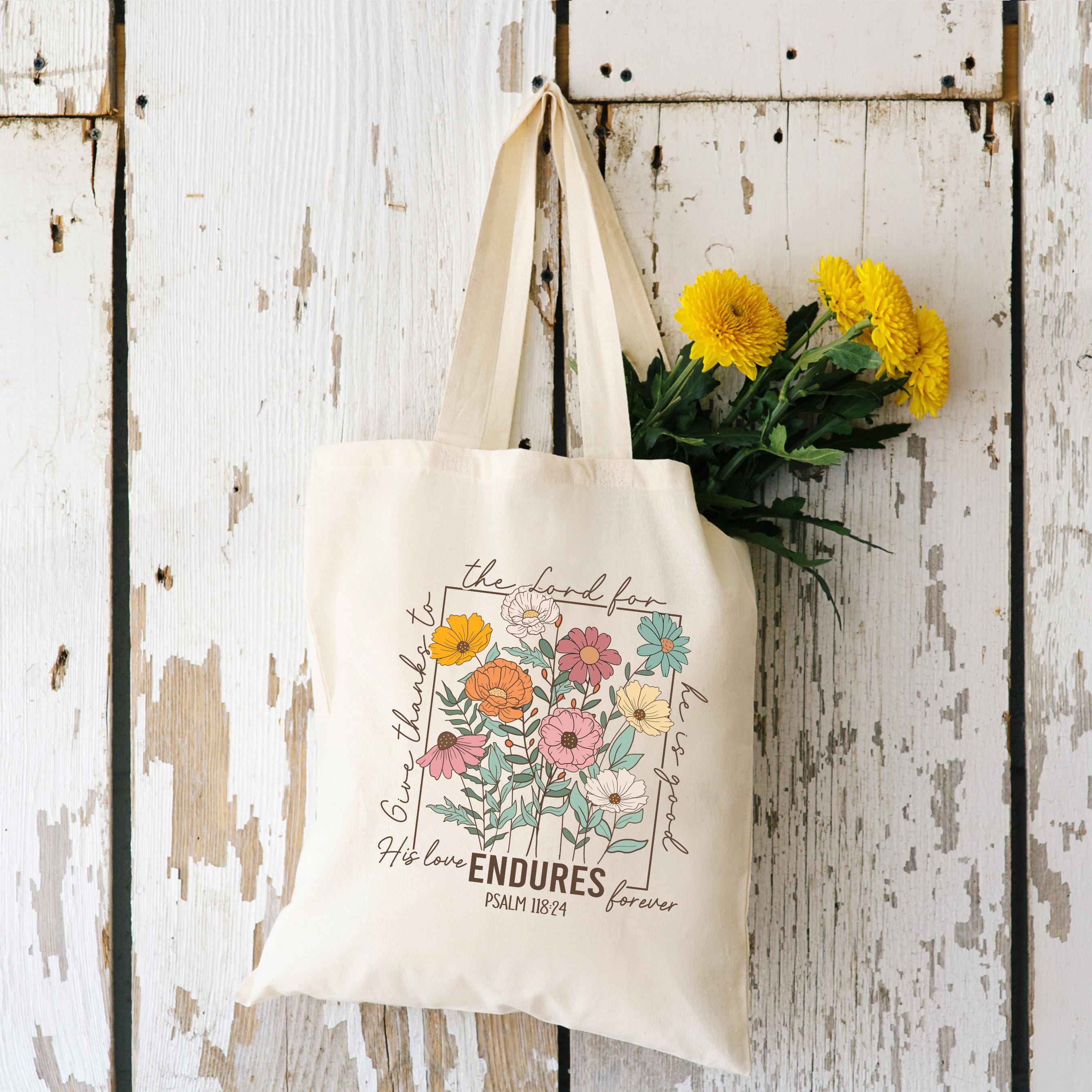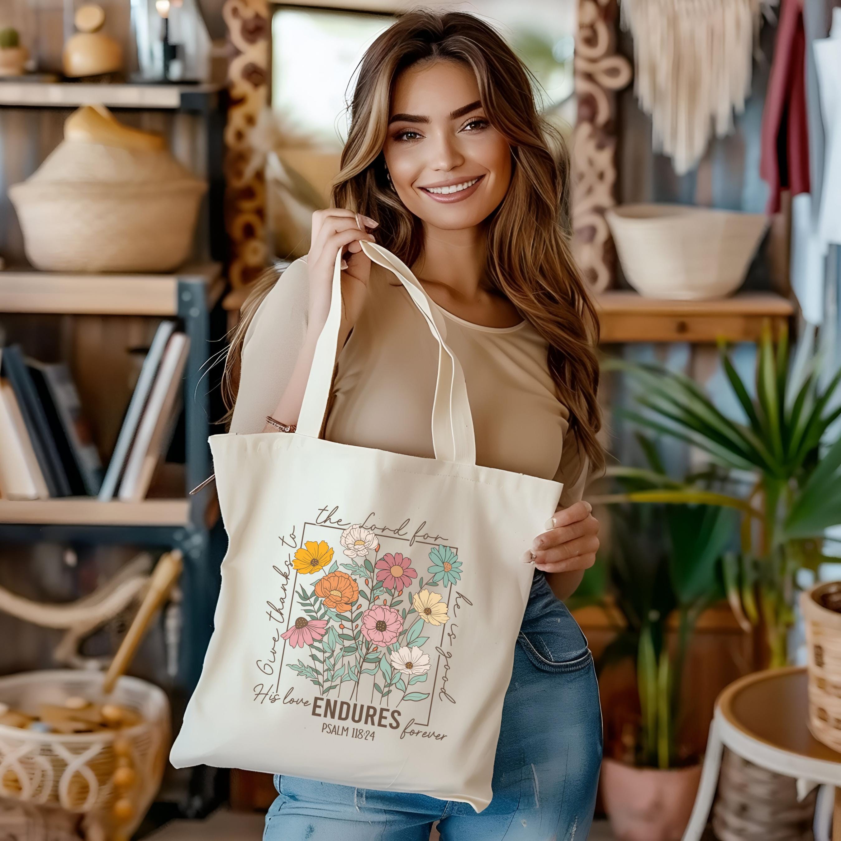 Introducing the "His Love Endures Forever" Cotton Canvas Tote Bag—a perfect blend of boho vintage charm and meaningful inspiration. Adorned with a beautiful floral design, this tote offers a gentle reminder of everlasting love wherever you go. Crafted from 100% cotton canvas, it's durable, eco-friendly, and ideal for those who appreciate both style and sustainability.